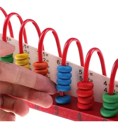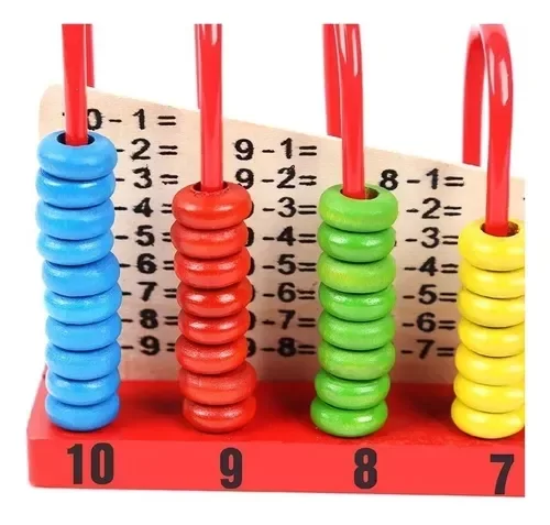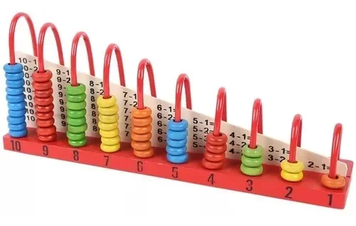 Incluye 10 columnas numeradas con cuentas de colores vivos que facilitan la comprensión visual del conteo y las operaciones básicas.
