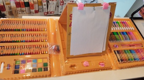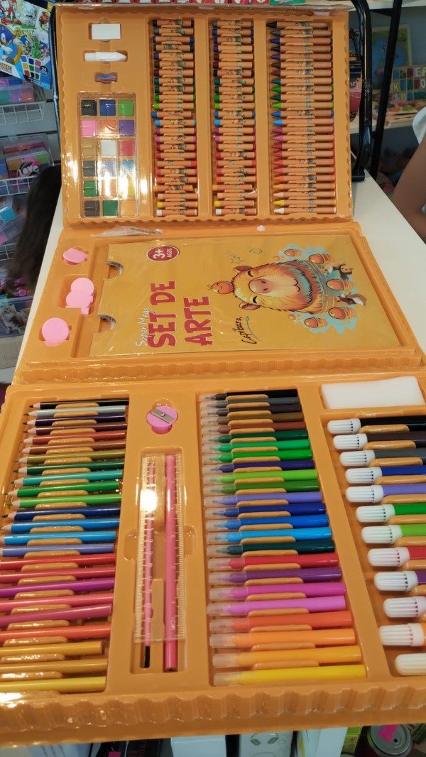 • Dibujo y pintura: Marcadores, crayones, lápices de colores, pasteles de acuarela, pasteles al óleo, papeles de dibujo, clips de papel, bolígrafos de acuarela, mini marcadores, atril y demás accesorios.
