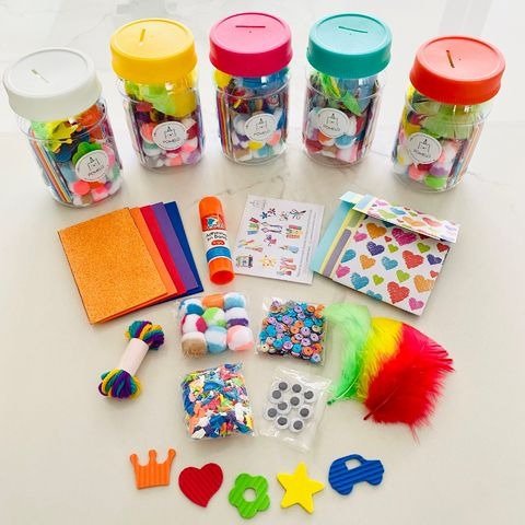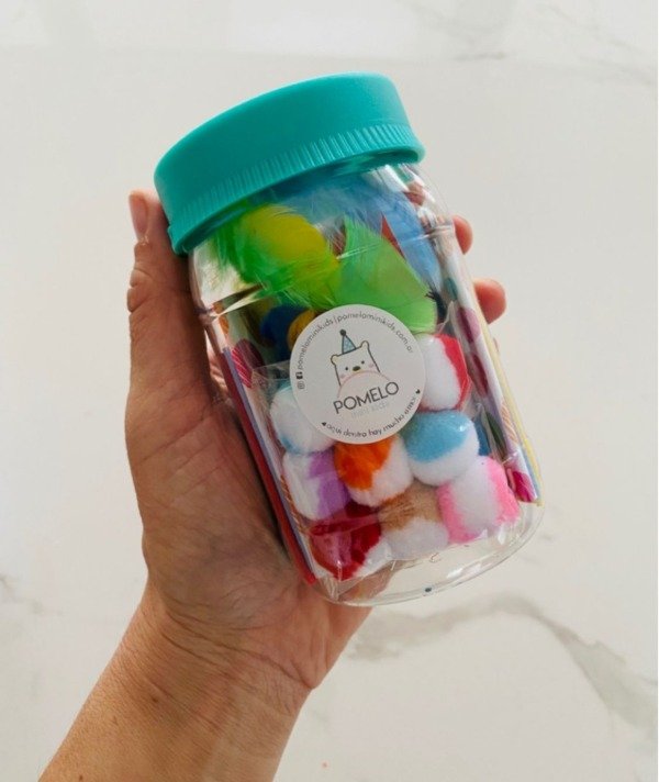 Este original pote está lleno de materiales de arte y manualidades para crear sin parar: fibrones, lápices, tijerita, stickers, papeles y más. Y cuando terminás de usarlo… ¡se transforma en una alcancía para guardar tus ahorros!