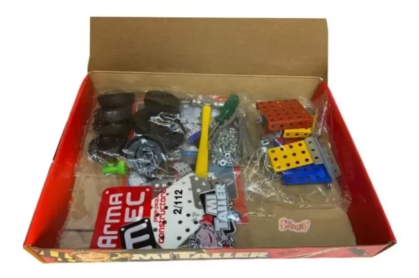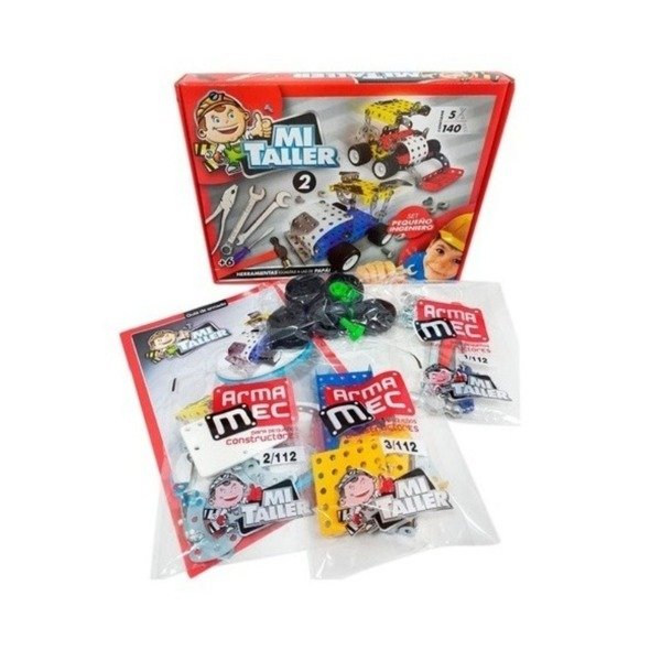 Contiene 140 piezas de metal multiformas y 5 herramientas (modelo 1112 autito).