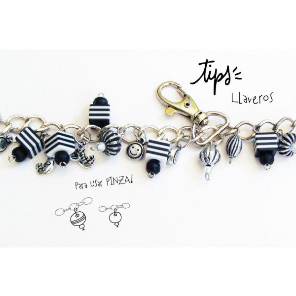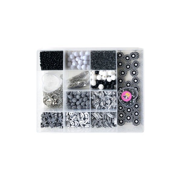 Medidas: 22.5x17.5x4.5 cm. Viene con mostacillas de vidrio, plástico, acrílico, formitas para usar de dijes, cadenas, arandelas y palitos metálicos para los dijes, gomitas, todo en tonos blanco y negro.