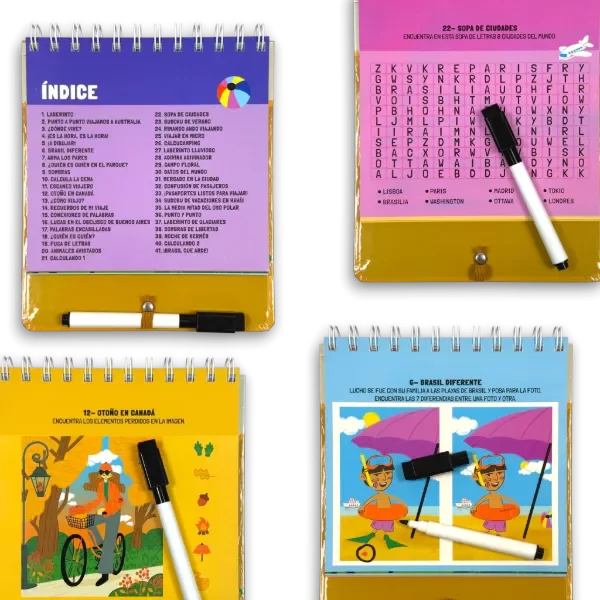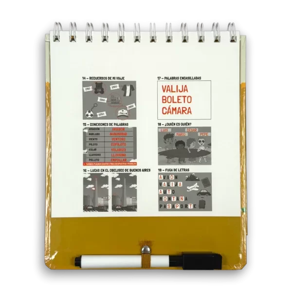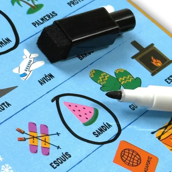 Además, incluye un fibrón con borrador que se guarda en el mismo cuaderno: ¡perfecto para usar en casa, en la escuela, o mientras viajan!