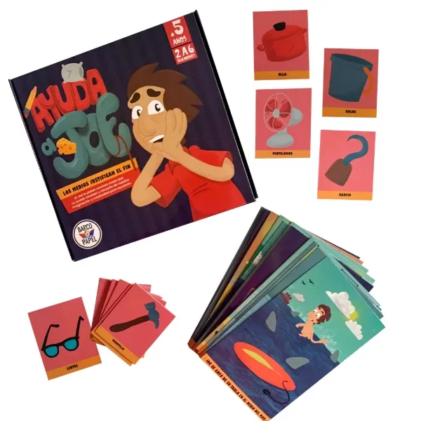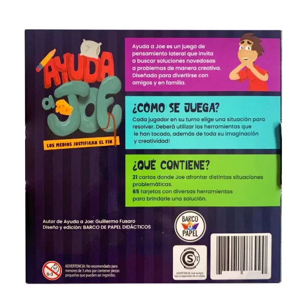 Ayuda a Joe es un juego de pensamiento creativo en el que tendrás que ayudar a Joe a resolver situaciones problemáticas usando herramientas inesperadas. Este juego te invita a usar toda tu imaginación para encontrar soluciones originales y creativas. Con 21 cartas de situaciones y 65 cartas de herramientas, no hay respuestas incorrectas, lo único que importa es justificar bien tu solución y usar tu ingenio.