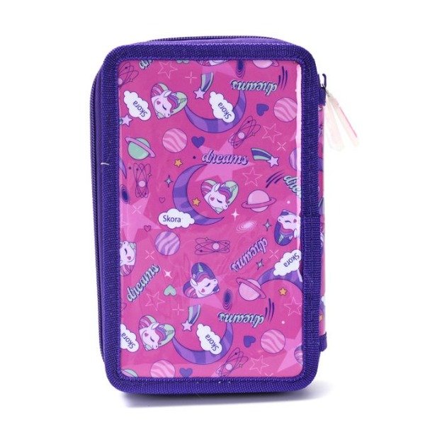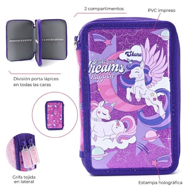 La Cartuchera Escolar 2 Pisos Skora unicornio es el accesorio perfecto para mantener organizados todos tus útiles escolares. Con un diseño atractivo y funcional, esta cartuchera cuenta con dos compartimentos amplios que permiten una fácil clasificación de lápices, bolígrafos y otros materiales. Fabricada en poliéster y PVC, garantiza durabilidad y resistencia al desgaste diario. Sus medidas de 21 x 15 x 4 cm la hacen ideal para llevar en mochilas sin ocupar demasiado espacio. Además, su diseño no es extensible, lo que asegura que se mantenga compacta y fácil de manejar. La cartuchera es nueva y está lista para acompañarte en todas tus aventuras escolares.